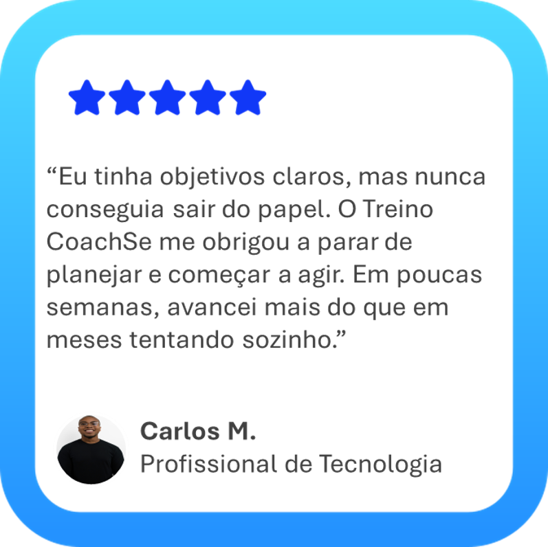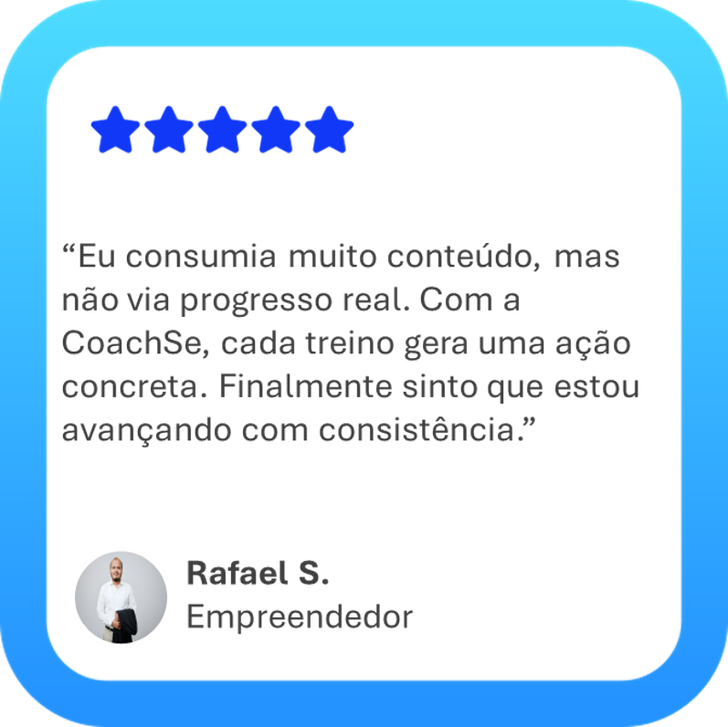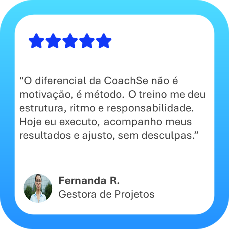 Desenvolver-se sozinho é difícil. Por isso, a CoachSe oferece direção, clareza e suporte ao longo do processo, ajudando você a manter foco, consistência e ritmo de execução.